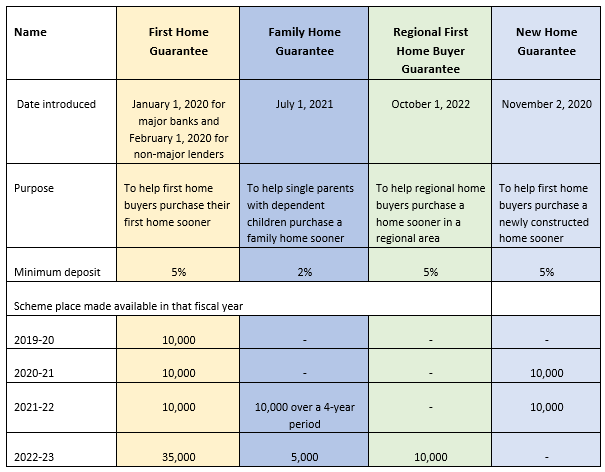 In the early part of the decade, the Australian government launched four related programs under the Home Guarantee Scheme to support different types of buyers: