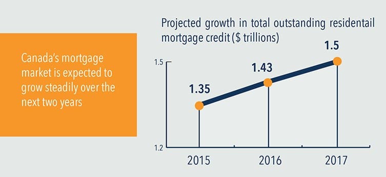 Canada’s mortgage market is expected to grow steadily over the next two years, as low interest rates and a relatively stable financial system continue to fuel demand for residential housing. After averaging 7.7% annual growth over the past decade, mortgage credit growth has slowed to just below 6% year-over-year. This figure could fall to about 5.25% by the end of the year before holding steady at 5% during 2017. If these estimates hold, mortgage credit could grow by about 11% by the end of 2017.